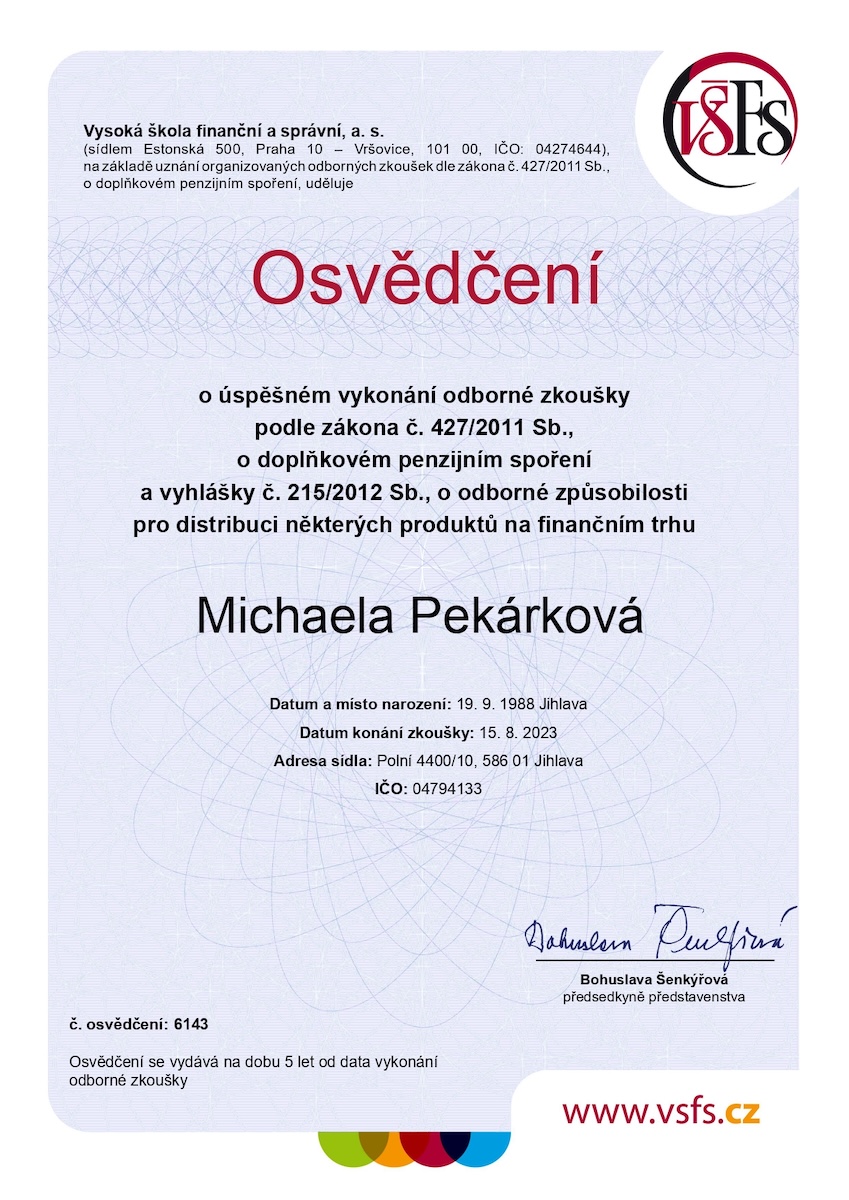 Mým profesním posláním je pomáhat Vám budovat majetek a chránit finanční stabilitu. Ať už se jedná o efektivní zhodnocování úspor, plánování důchodu, koupi nemovitosti, zajištění rodiny nebo přípravu na důležité životní události – vždy hledám cesty, jak sladit výnos, bezpečí, flexibilitu a ohled na Vaše plány.