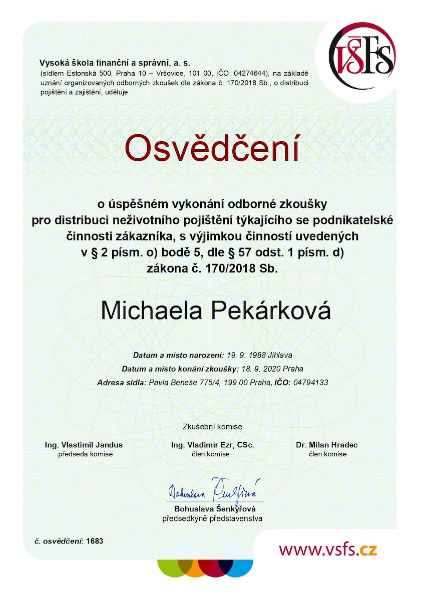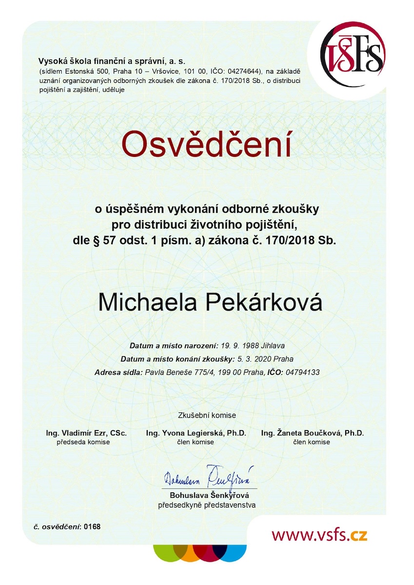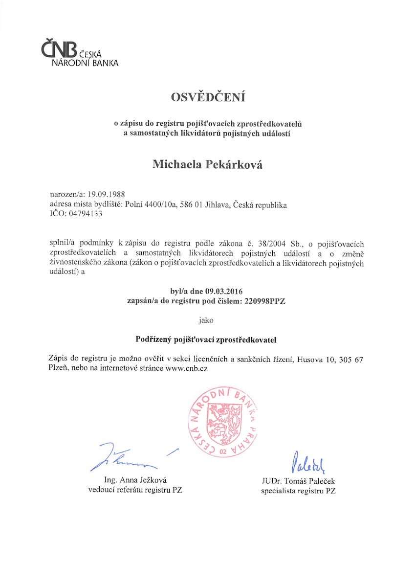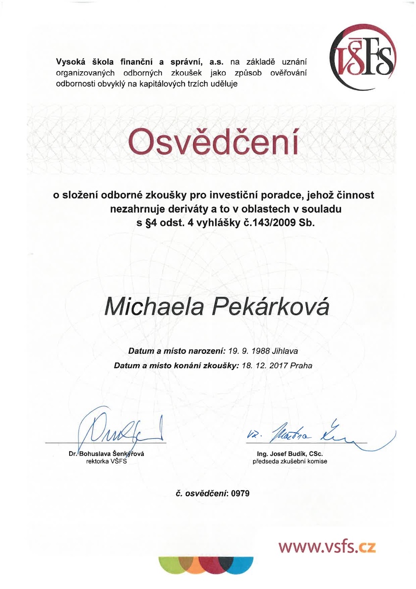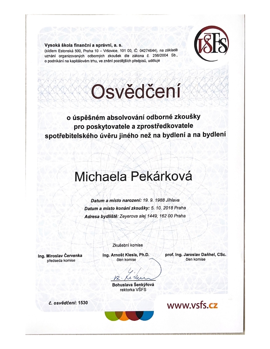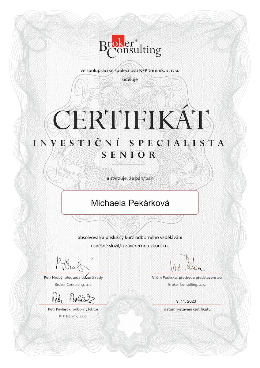 Pracuji s hlubokým respektem k Vaší důvěře, protože si uvědomuji, že finanční rozhodnutí jsou často spojena s emocemi, odpovědností a dlouhodobými dopady. To vše pro mě znamená závazek poskytovat Vám dlouhodobý servis a prvotřídní péči.